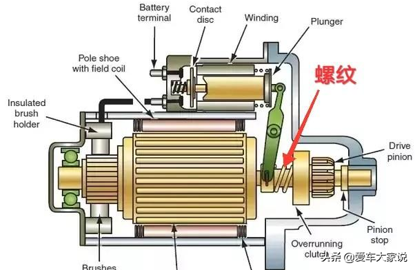 这张图应该很清楚地表明了起动机的工作原理。起动机通过齿轮驱动发动机的飞轮让发动机转起来的。