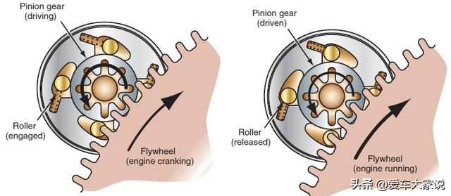 起动机驱动发动机的过程也是非常巧妙的,因为发动机运行时飞轮是一直转动的,所以起动机在不工作时其驱动齿轮不能一直接触飞轮,否则起动机很快就被弄坏了。