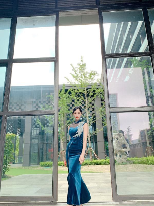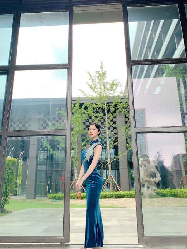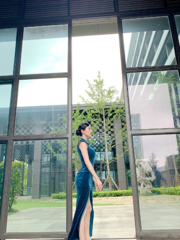 这一袭蓝色的丝绒旗袍,将克拉拉凹凸有致的身材展露无遗,曲线优美婀娜,深邃又静谧的蓝调,带出临花照水的雅致与温润,看似深沉的表面,实际上有着非常诱惑人心的光泽,与丝绒的妩媚高贵完美融合。