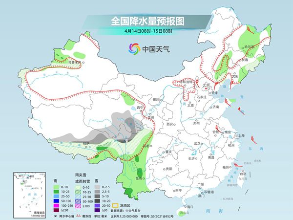 明天,新疆北疆沿天山地区和南疆西部山区、吉林东部、辽宁西部、西藏中东部、青海中南部、川西高原北部等地部分地区有小到中雪或雨夹雪,其中,西藏东北部、川西高原北部等地部分地区有大雪。新疆北疆北部和伊犁河谷、内蒙古东南部、黑龙江中部、辽宁东部、西藏东南部、西南地区西部、海南岛等地部分地区有小雨,局地中雨。