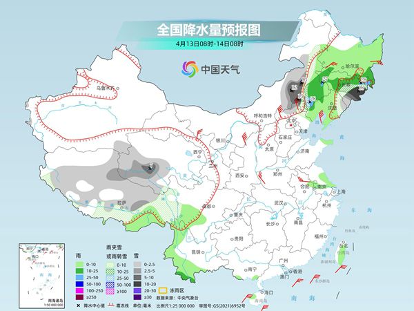 今天,东北地区、内蒙古东部、青藏高原等地还会有雨雪天气,部分地区有大到暴雪,南方大部降水停歇。中央气象台预计,内蒙古中东部、东北地区东部、河北北部、西藏大部、青海中南部、川西高原西部等地部分地区有小到中雪或雨夹雪,其中,内蒙古中东部、吉林东部、青海南部等地部分地区有大到暴雪。内蒙古东南部、东北地区西部和北部、西藏东南部、川西高原南部、云南西南部、台湾岛等地部分地区有小到中雨,其中,内蒙古东南部、吉林西部和北部、辽宁西部等地部分地区有大雨。