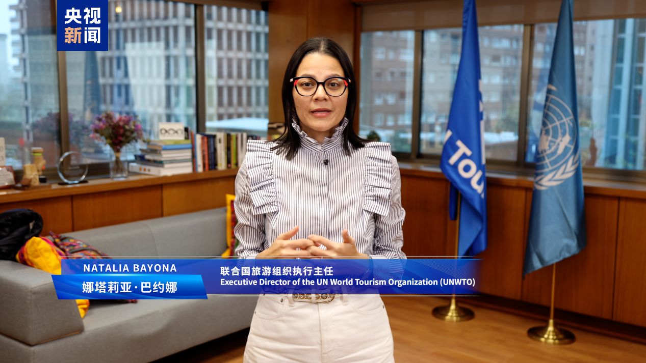 △联合国旅游组织执行主任娜塔莉亚·巴约娜 联合国旅游组织执行主任巴约娜在视频发言中表示,旅游业是推动文明对话的重要载体,能够消弭文化隔阂、深化价值共识、促进不同文明美美与共。中国中央广播电视总台作为全球旅游文化交流的积极践行者,有效构建起立体化国际传播矩阵,大力促进了民心相通与产业协同。