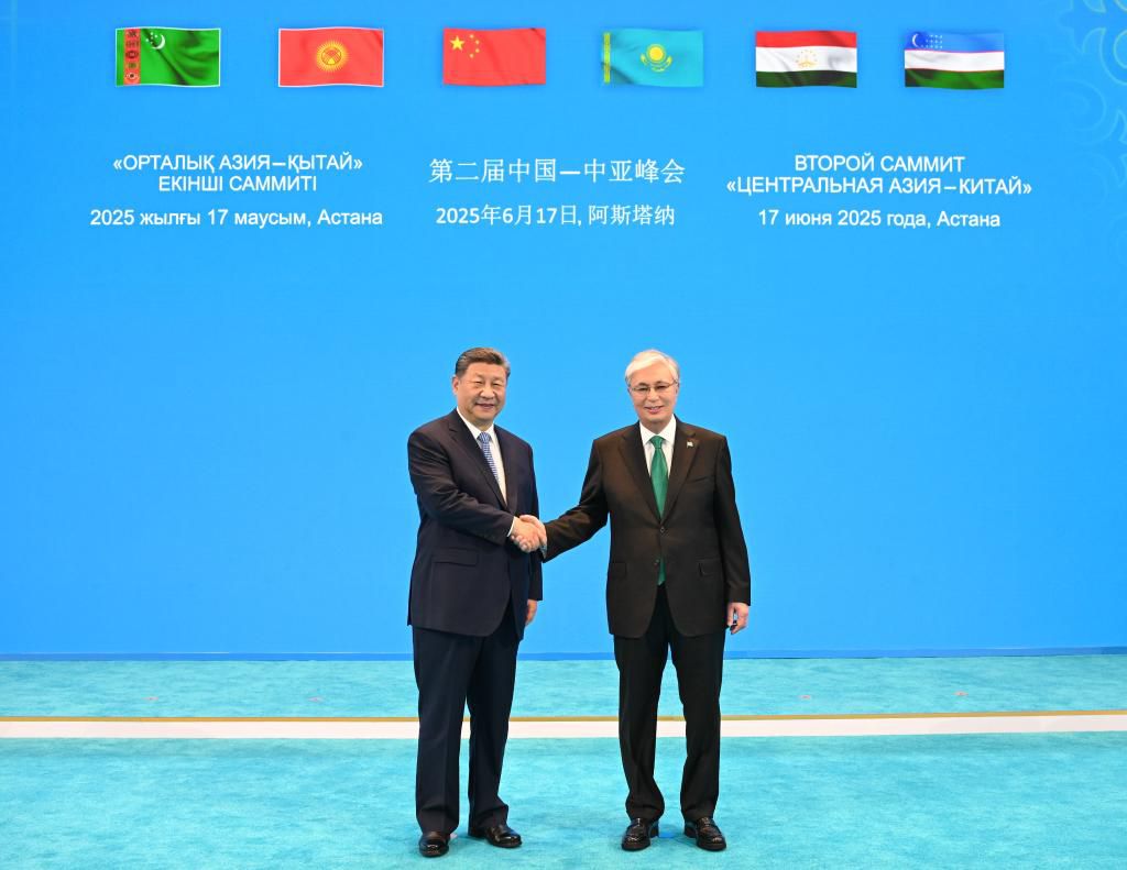 当地时间6月17日下午,第二届中国—中亚峰会在阿斯塔纳独立宫举行。习近平同中亚五国元首集体合影,随后出席峰会,发表题为《弘扬“中国—中亚精神” 推动地区合作高质量发展》的主旨发言。