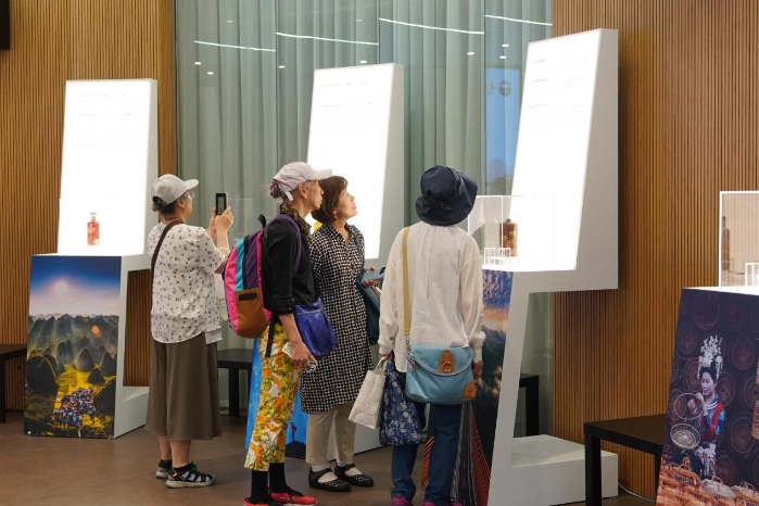 茅台与世博品牌艺术展陈立足中国馆一层纵深回转空间,通过多媒体、多载体、多形式展示茅台与世博的历史渊源、赤水河谷神奇的酿酒生态以及茅台封坛文化等。代表着1915年、2010年、2025年三个时间维度的通知文书、出版物、奖章、大方漆器、世博会茅台纪念酒及设计稿等,直观呈现了茅台乃至贵州与世博会长达一个多世纪的互动与关联,“酒糟纸”生态茅台酒经典瓶型艺术装置静静矗立,多款茅台酒主要产品在以贵州非遗、茅台工匠精神为元素的展柜里精心展出,吸引了众多观众前来参观打卡。